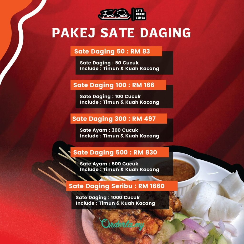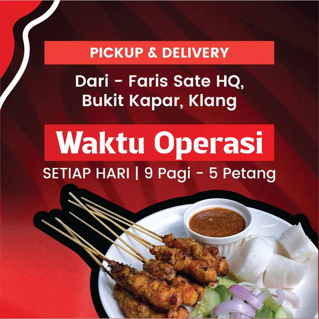 Pilih mengikut waktu operasi dan lokasi yang kami available dan sesuai dengan waktu tempahan anda. Untuk kepastian waktu operasi semasa, anda boleh rujuk di Instagram & Tiktok story rasmi Faris Sate.